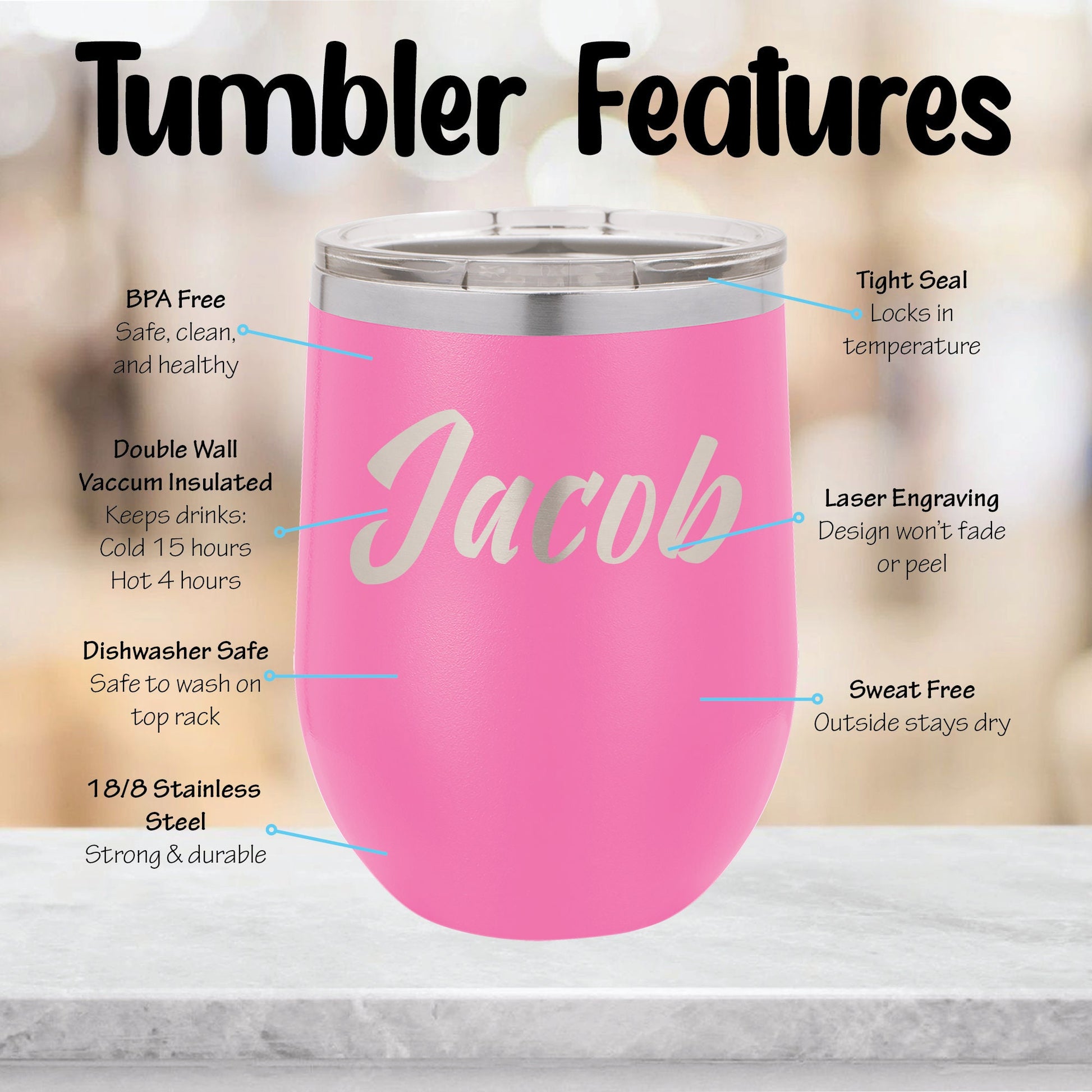 12oz personalized insulated stemless wine tumblers make an outstanding and extremely durable gift. These tough tumblers have a double-wall vacuum that keeps hot beverages hot for up to 4 hours and cold drinks cold for up to 15 hours. Another benefit of this double-wall vacuum is no pesky water rings on your coffee tables.