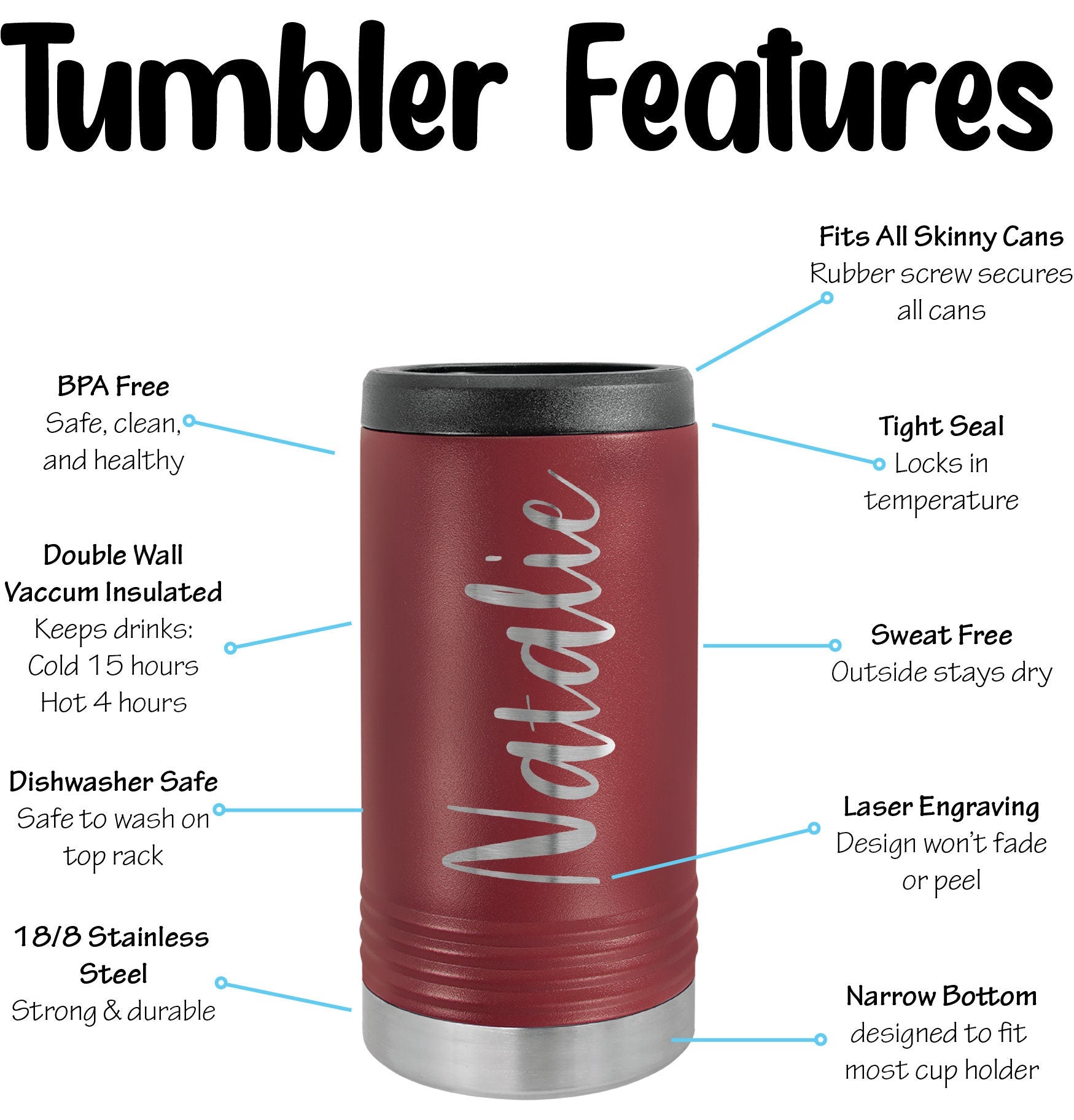 Personalized insulated skinny can coolers make an outstanding and extremely durable gift. These tough tumblers have a double-wall vacuum that keeps hot beverages hot for up to 4 hours and cold drinks cold for up to 15 hours. Another benefit of this double-wall vacuum is no pesky water rings on your coffee tables.