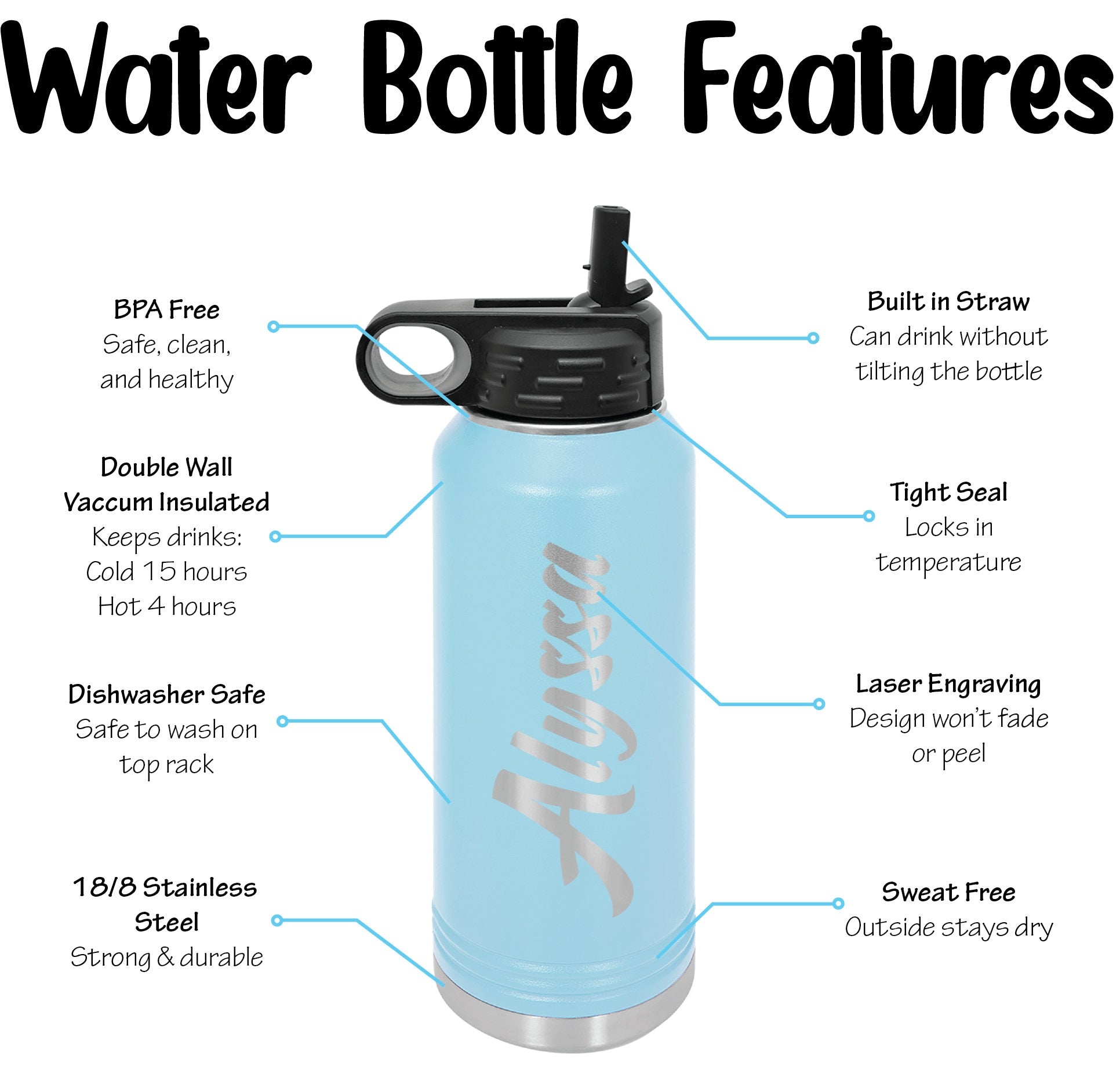 32/20oz personalized insulated water bottles make an outstanding and extremely durable gift. These tough tumblers have a double-wall vacuum that keeps hot beverages hot for up to 4 hours and cold drinks cold for up to 15 hours. Another benefit of this double-wall vacuum is no pesky water rings on your coffee tables.